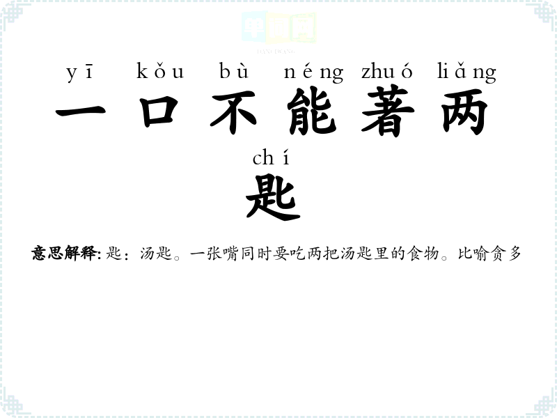 | 一口不能著两匙 | 匙:汤匙。一张嘴同时要吃两把汤匙里的食物。比喻贪多 |