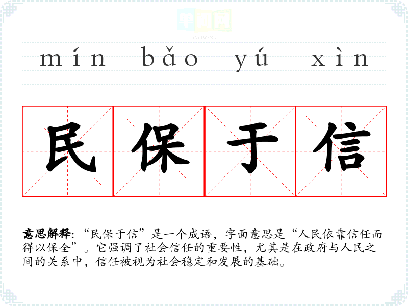 “民保于信”是一个成语,字面意思是“人民依靠信任而得以保全”。它强调了社会信任的重要性,尤其是在政府与人民之间的关系中,信任被视为社会稳定和发展的基础。