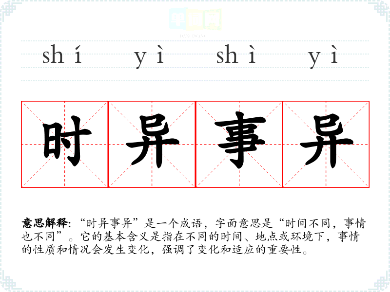 - 演讲:在演讲中,可以用“时异事异”来强调适应变化的重要性,鼓励听众面对新挑战。
