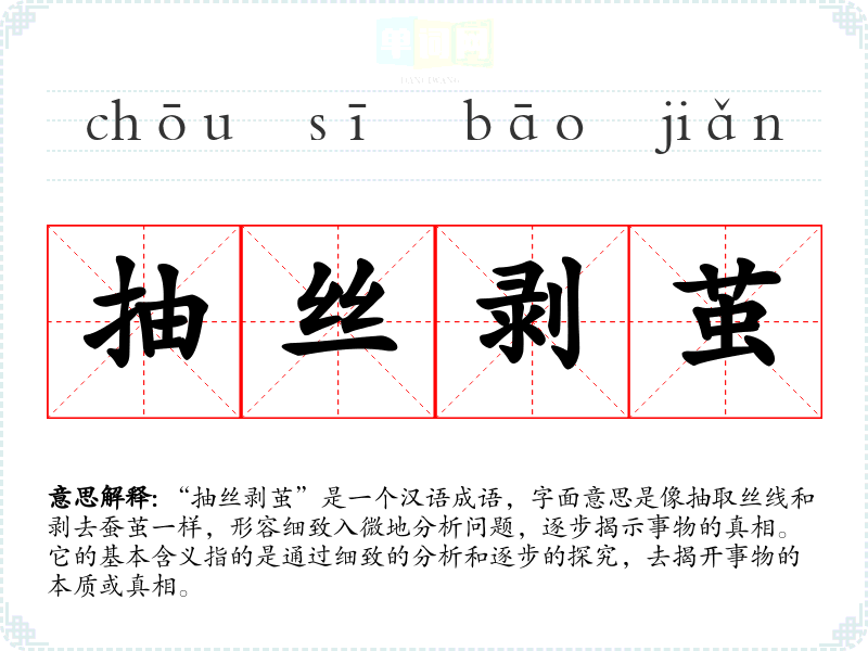 “抽丝剥茧”是一个汉语成语,字面意思是像抽取丝线和剥去蚕茧一样,形容细致入微地分析问题,逐步揭示事物的真相。它的基本含义指的是通过细致的分析和逐步的探究,去揭开事物的本质或真相。
