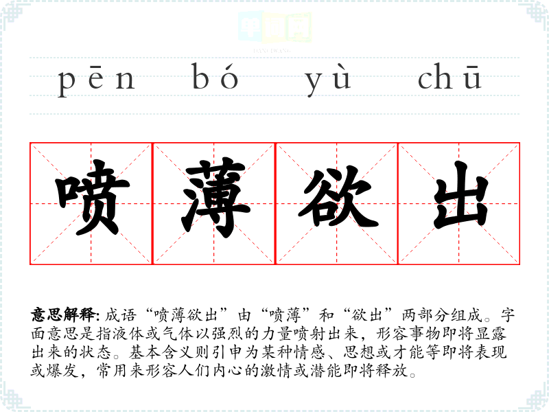 成语“喷欲出”由“喷”和“欲出”两部分组成。字面意思是指液体或气体以强烈的力量喷射出来,形容事物即将显露出来的状态。基本含义则引申为某种情感、思想或才能等即将表现或爆发,常用来形容人们内心的激情或潜能即将释放。