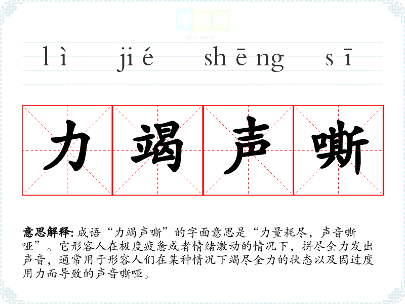 成语“力竭声嘶”的字面意思是“力量耗尽,声音嘶哑”。它形容人在极度疲惫或者情绪激动的情况下,拼尽全力发出声音,通常用于形容人们在某种情况下竭尽全力的状态以及因过度用力而导致的声音嘶哑。
