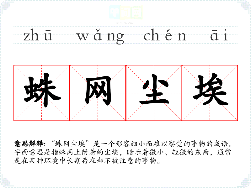 该成语的具体出处并不是很明确,但其构成的字词在古代文学中常常用来形容微小的物体。蛛网本身象征着细腻和脆弱,而尘埃则是常见的微小颗粒,结合在一起,强调了某种事物的细微和被忽视的状态。