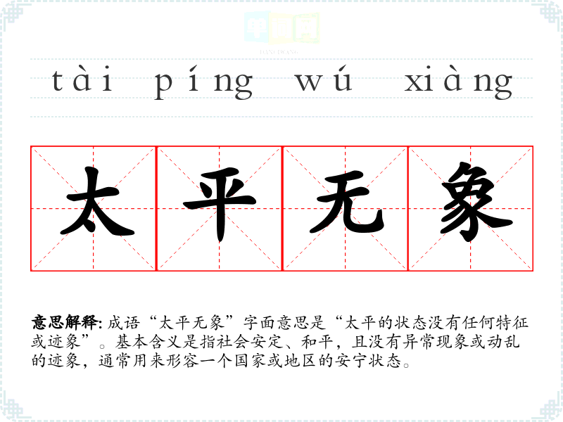 成语“太平无象”字面意思是“太平的状态没有任何特征或迹象”。基本含义是指社会安定、和平,且没有异常现象或动乱的迹象,通常用来形容一个国家或地区的安宁状态。