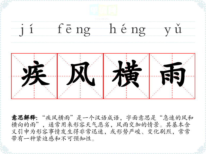 “疾风横雨”是一个汉语成语,字面意思是“急速的风和横向的雨”,通常用来形容天气恶劣,风雨交加的情景。其基本含义引申为形容事情发生得非常迅速,或形势严峻、变化剧烈,常常带有一种紧迫感和不可预知性。