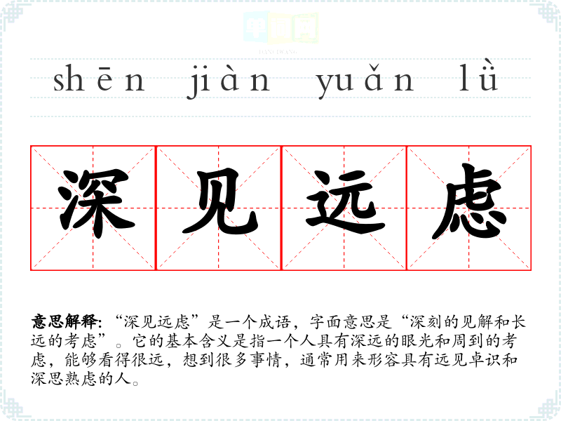 “深见远虑”是一个成语,字面意思是“深刻的见解和长远的考虑”。它的基本含义是指一个人具有深远的眼光和周到的考虑,能够看得很远,想到很多事情,通常用来形容具有远见卓识和深思熟虑的人。