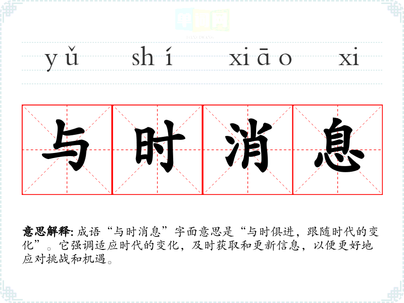 成语“与时消息”字面意思是“与时俱进,跟随时代的变化”。它强调适应时代的变化,及时获取和更新信息,以便更好地应对挑战和机遇。