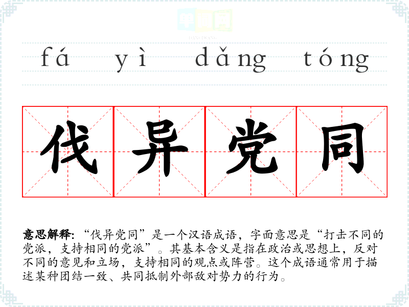 “伐异党同”是一个汉语成语,字面意思是“打击不同的党派,支持相同的党派”。其基本含义是指在政治或思想上,反对不同的意见和立场,支持相同的观点或阵营。这个成语通常用于描述某种团结一致、共同抵制外部敌对势力的行为。