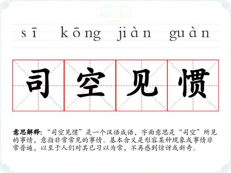 | 司空见惯 | 司空:古代官名。指某事常见,不足为奇。 |