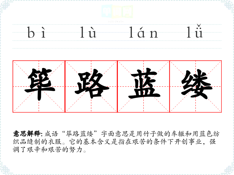 成语“筚路蓝缕”字面意思是用竹子做的车辙和用蓝色纺织品缝制的衣服。它的基本含义是指在艰苦的条件下开创事业,强调了艰辛和艰苦的努力。