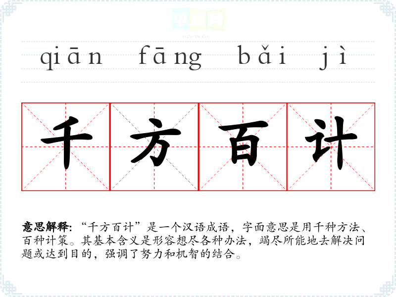 “千方百计”是一个汉语成语,字面意思是用千种方法、百种计策。其基本含义是形容想尽各种办法,竭尽所能地去解决问题或达到目的,强调了努力和机智的结合。