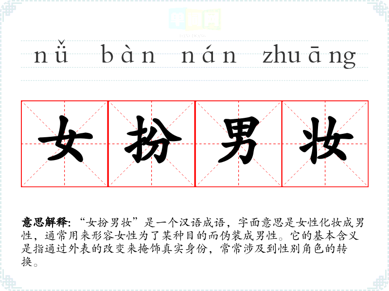“女扮男妆”是一个汉语成语,字面意思是女性化妆成男性,通常用来形容女性为了某种目的而伪装成男性。它的基本含义是指通过外表的改变来掩饰真实身份,常常涉及到性别角色的转换。