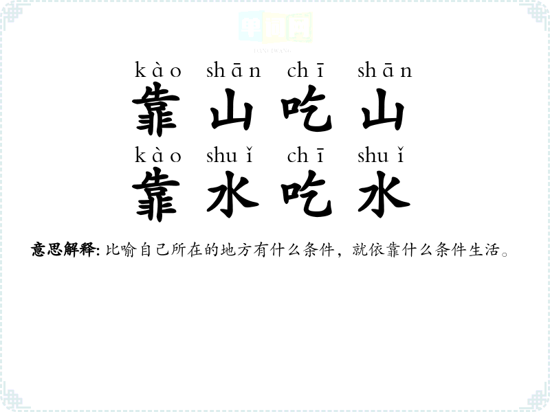 | 靠山吃山,靠水吃水 | 比喻自己所在的地方有什么条件,就依靠什么条件生活。 |