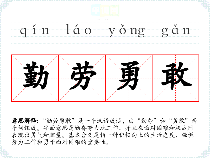 | 勤劳勇敢 | 勤奋劳动,有勇气,有胆量。 |