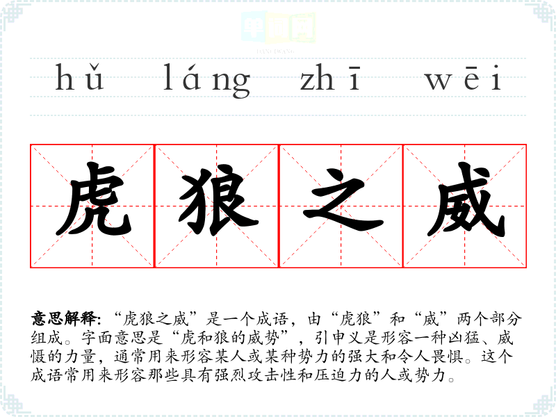 “虎狼之威”是一个成语,由“虎狼”和“威”两个部分组成。字面意思是“虎和狼的威势”,引申义是形容一种凶猛、威慑的力量,通常用来形容某人或某种势力的强大和令人畏惧。这个成语常用来形容那些具有强烈攻击性和压迫力的人或势力。