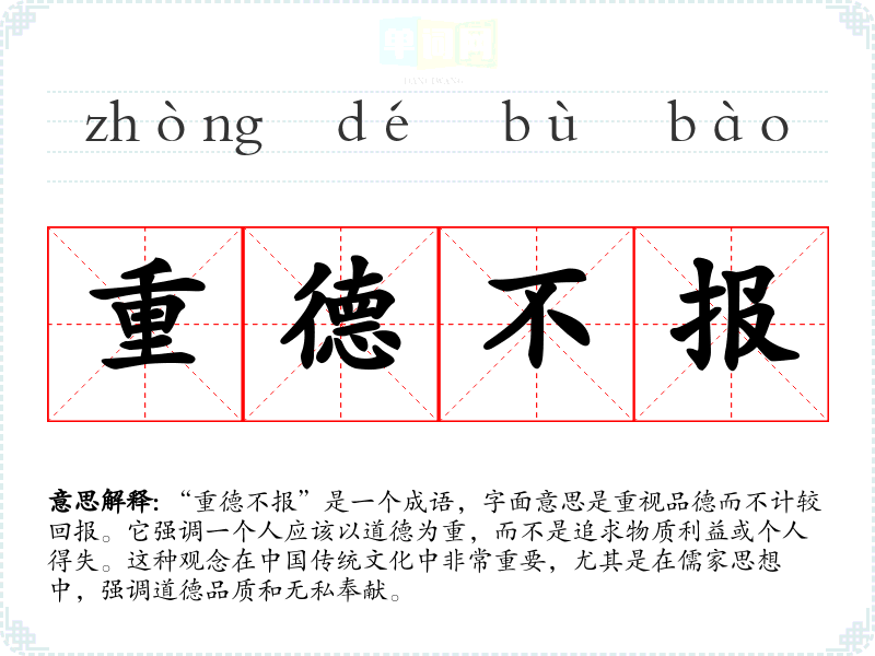 “重德不报”并没有确切的历史文献作为出处,但其思想根源可以追溯到儒家经典。儒家学派提倡仁义礼智信,强调个人的道德修养和对他人的无私奉献。孔子在《论语》中多次提到道德的重视和对他人恩惠的感恩,而不以回报为目的。这种思想演变为“重德不报”的成语,体现了对道德价值的推崇。