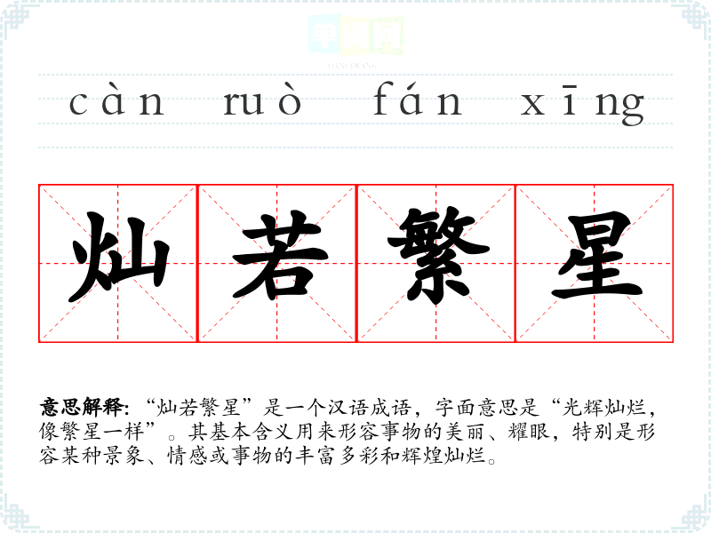 “灿若繁星”是一个汉语成语,字面意思是“光辉灿烂,像繁星一样”。其基本含义用来形容事物的美丽、耀眼,特别是形容某种景象、情感或事物的丰富多彩和辉煌灿烂。