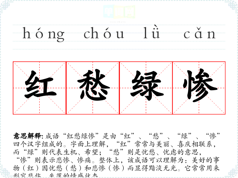 成语“红愁绿惨”是由“红”、“愁”、“绿”、“惨”四个汉字组成的。字面上理解,“红”常常与美丽、喜庆相联系,而“绿”则代表生机、希望;“愁”则是忧愁、忧虑的意思,“惨”则表示悲惨、惨痛。整体上,该成语可以理解为:美好的事物(红)因忧愁(愁)和悲惨(惨)而显得黯淡无光。它常常用来形容悲伤、失落的情感状态。