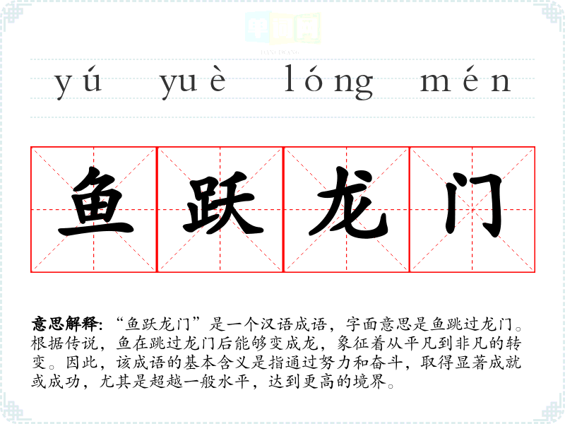 “鱼跃龙门”是一个汉语成语,字面意思是鱼跳过龙门。根据传说,鱼在跳过龙门后能够变成龙,象征着从平凡到非凡的转变。因此,该成语的基本含义是指通过努力和奋斗,取得显著成就或成功,尤其是超越一般水平,达到更高的境界。