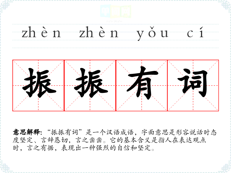 “振振有词”是一个汉语成语,字面意思是形容说话时态度坚定、言辞恳切,言之凿凿。它的基本含义是指人在表达观点时,言之有据,表现出一种强烈的自信和坚定。