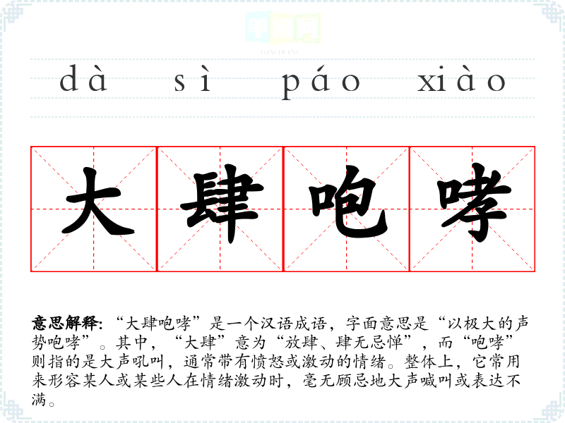 该成语并没有特定的历史典故或文学出处,但其构成的词汇在汉语中都有较为悠久的使用历史。“大肆”常用来描述行为放纵的状态,而“咆哮”则源于对猛兽如狮子、**等的描述,象征着强烈的情感波动。该成语的组合展示了人类情感的剧烈反应。