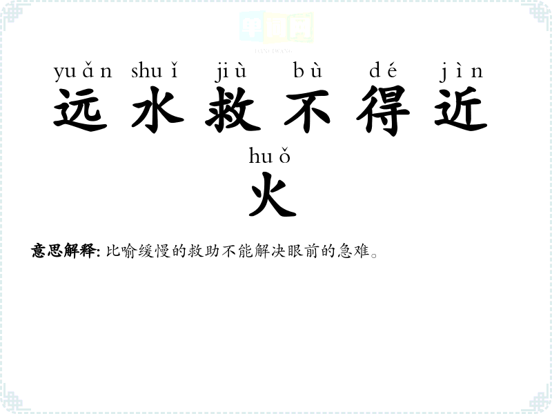 | 远井不解近渴 | 指遥远的帮助解决不了目前迫切的需求。 |