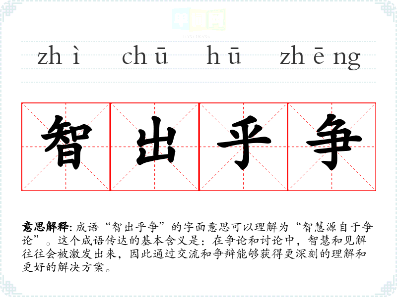 成语“智出乎争”的字面意思可以理解为“智慧源自于争论”。这个成语传达的基本含义是:在争论和讨论中,智慧和见解往往会被激发出来,因此通过交流和争辩能够获得更深刻的理解和更好的解决方案。