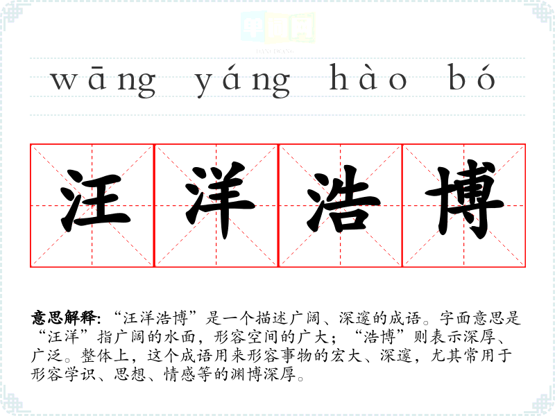 “汪洋浩博”是一个描述广阔、深邃的成语。字面意思是“汪洋”指广阔的水面,形容空间的广大;“浩博”则表示深厚、广泛。整体上,这个成语用来形容事物的宏大、深邃,尤其常用于形容学识、思想、情感等的渊博深厚。
