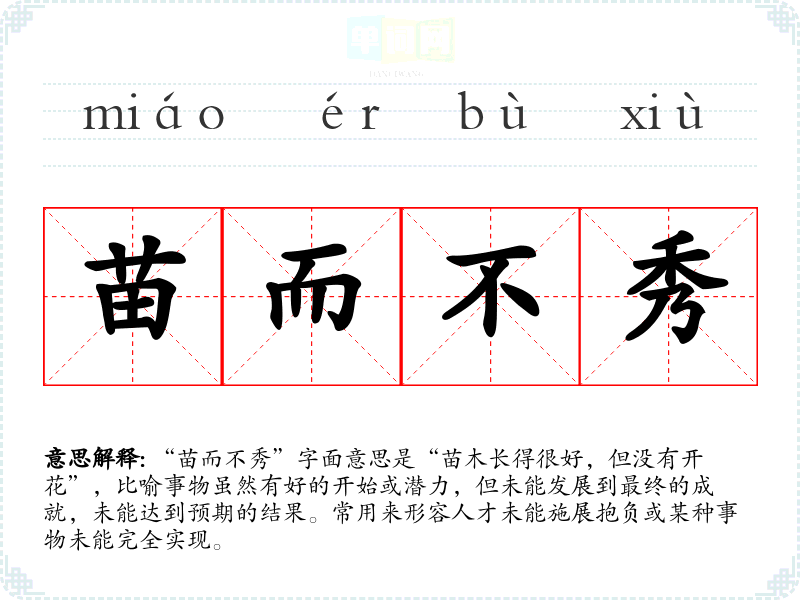 “苗而不秀”字面意思是“苗木长得很好,但没有开花”,比喻事物虽然有好的开始或潜力,但未能发展到最终的成就,未能达到预期的结果。常用来形容人才未能施展抱负或某种事物未能完全实现。
