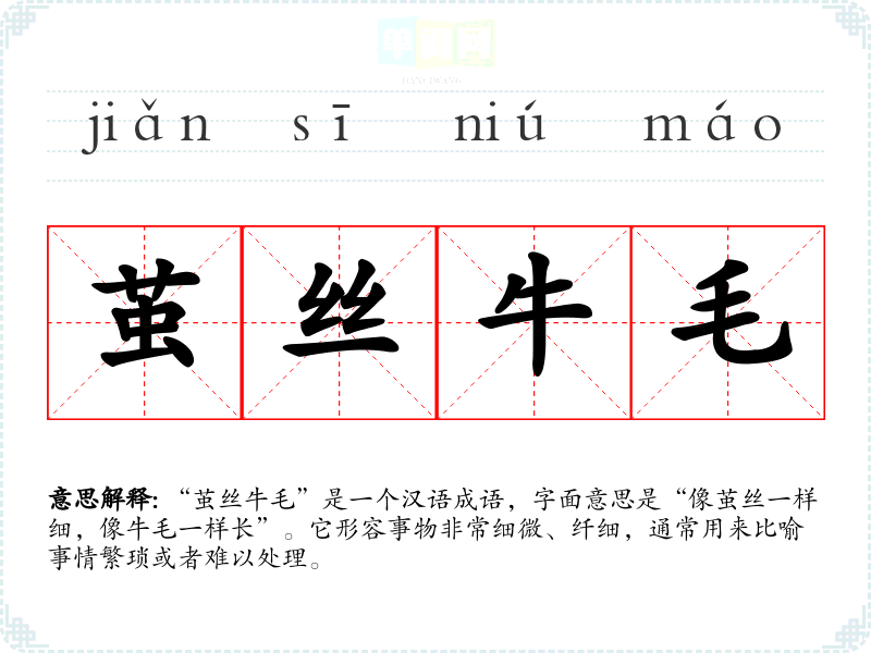 “茧丝牛毛”是一个汉语成语,字面意思是“像茧丝一样细,像牛毛一样长”。它形容事物非常细微、纤细,通常用来比喻事情繁琐或者难以处理。