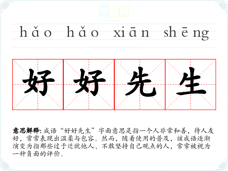成语“好好先生”字面意思是指一个人非常和善,待人友好,常常表现出温柔与包容。然而,随着使用的普及,该成语逐渐演变为指那些过于迁就他人、不敢坚持自己观点的人,常常被视为一种负面的评价。