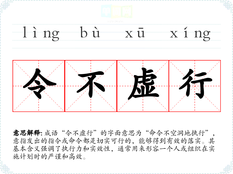 成语“令不虚行”的字面意思为“命令不空洞地执行”,意指发出的指令或命令都是切实可行的,能够得到有效的落实。其基本含义强调了执行力和实效性,通常用来形容一个人或组织在实施计划时的严谨和高效。