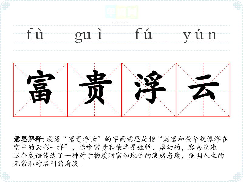 成语“富贵浮云”的字面意思是指“财富和荣华就像浮在空中的云彩一样”,隐喻富贵和荣华是短暂、虚幻的,容易消逝。这个成语传达了一种对于物质财富和地位的淡然态度,强调人生的无常和对名利的看淡。