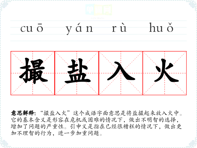 “撮盐入火”这个成语字面意思是将盐撮起来放入火中。它的基本含义是形容在危机或困难的情况下,做出不明智的选择,增加了问题的严重性。引申义是指在已经很糟糕的情况下,做出更加不理智的行为,进一步加重问题。