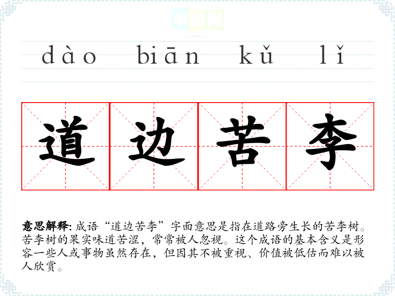 成语“道边苦李”字面意思是指在道路旁生长的苦李树。苦李树的果实味道苦涩,常常被人忽视。这个成语的基本含义是形容一些人或事物虽然存在,但因其不被重视、价值被低估而难以被人欣赏。
