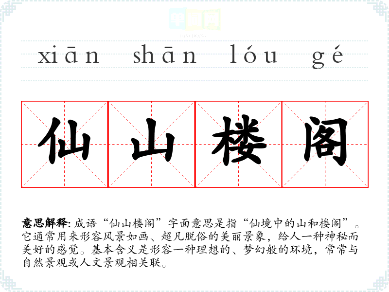 成语“仙山楼阁”字面意思是指“仙境中的山和楼阁”。它通常用来形容风景如画、超凡脱俗的美丽景象,给人一种神秘而美好的感觉。基本含义是形容一种理想的、梦幻般的环境,常常与自然景观或人文景观相关联。