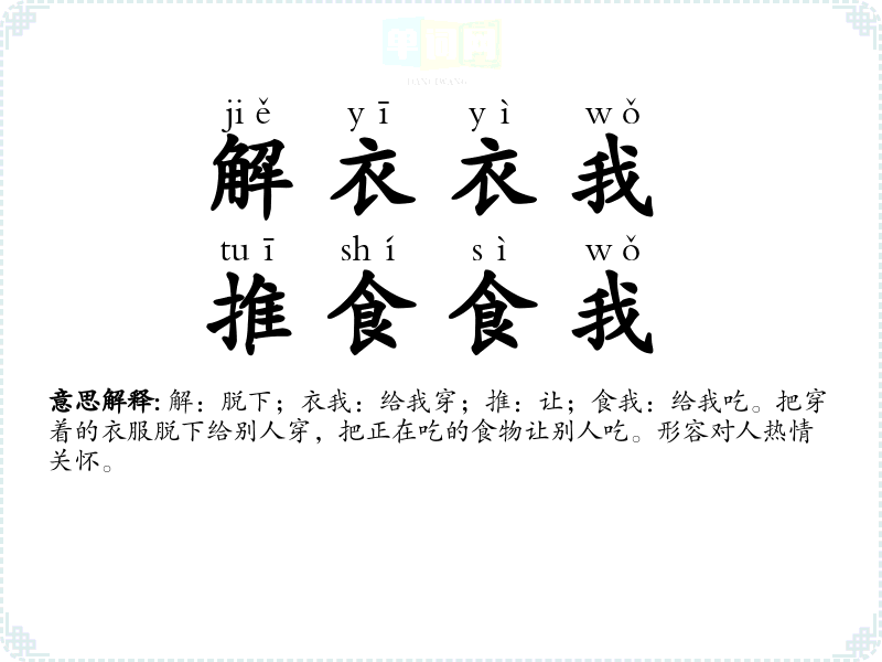 解:脱下;衣我:给我穿;推:让;食我:给我吃。把穿着的衣服脱下给别人穿,把正在吃的食物让别人吃。形容对人热情关怀。