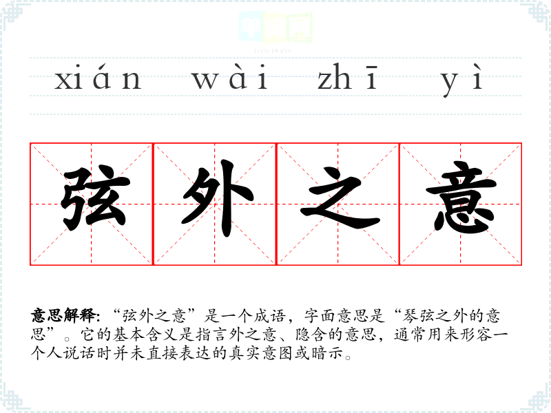 “弦外之意”是一个成语,字面意思是“琴弦之外的意思”。它的基本含义是指言外之意、隐含的意思,通常用来形容一个人说话时并未直接表达的真实意图或暗示。