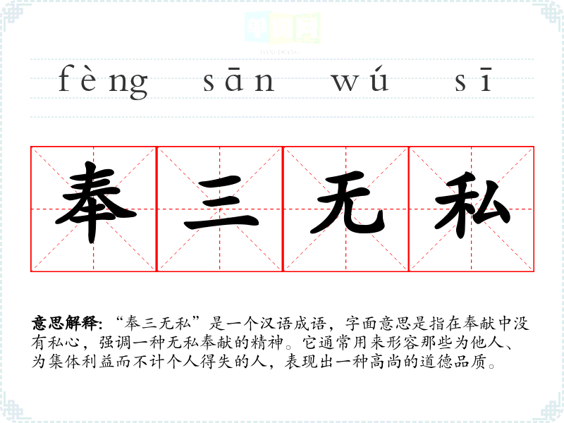 “奉三无私”是一个汉语成语,字面意思是指在奉献中没有私心,强调一种无私奉献的精神。它通常用来形容那些为他人、为集体利益而不计个人得失的人,表现出一种高尚的道德品质。
