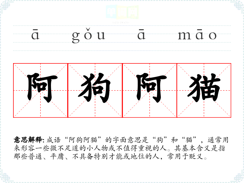 成语“阿狗阿猫”的字面意思是“狗”和“猫”,通常用来形容一些微不足道的小人物或不值得重视的人。其基本含义是指那些普通、平庸、不具备特别才能或地位的人,常用于贬义。
