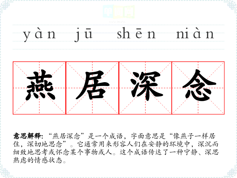 在**传统文化中,燕子常被视为吉祥的象征,代表着春天的到来和团圆的美好寓意。因此,“燕居深念”不仅体现了对故人的思念,也反映了对生活的深刻理解和对平静时光的珍惜。这一成语在现代社会中依然适用,尤其在快节奏的生活中,提醒人们停下脚步,进行深思。