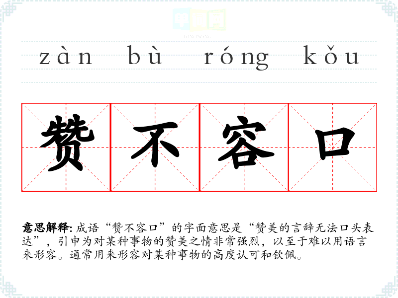 “赞不容口”并没有明确的历史典故,但它可以被看作是对汉语中“赞”和“容”的结合运用。“赞”指赞美、称赞,而“容”则有容纳、包容之意。这个成语可能是在文化交流和对美好事物的追求中逐渐形成的,强调了对美好事物的赞美之情。
