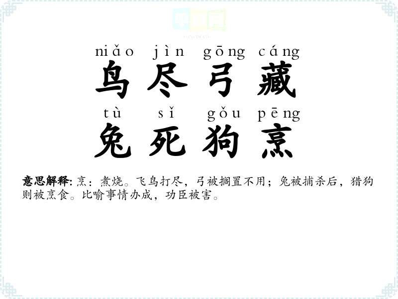 | 狡兔死,良狗烹 | 烹:烧煮。兔子死了,猎狗就被人烹食。比喻给统治者效劳的人事成后被抛弃或杀掉。 |