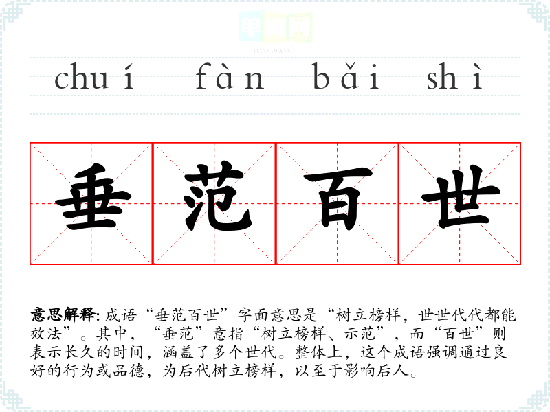 成语“垂范百世”字面意思是“树立榜样,世世代代都能效法”。其中,“垂范”意指“树立榜样、示范”,而“百世”则表示长久的时间,涵盖了多个世代。整体上,这个成语强调通过良好的行为或品德,为后代树立榜样,以至于影响后人。