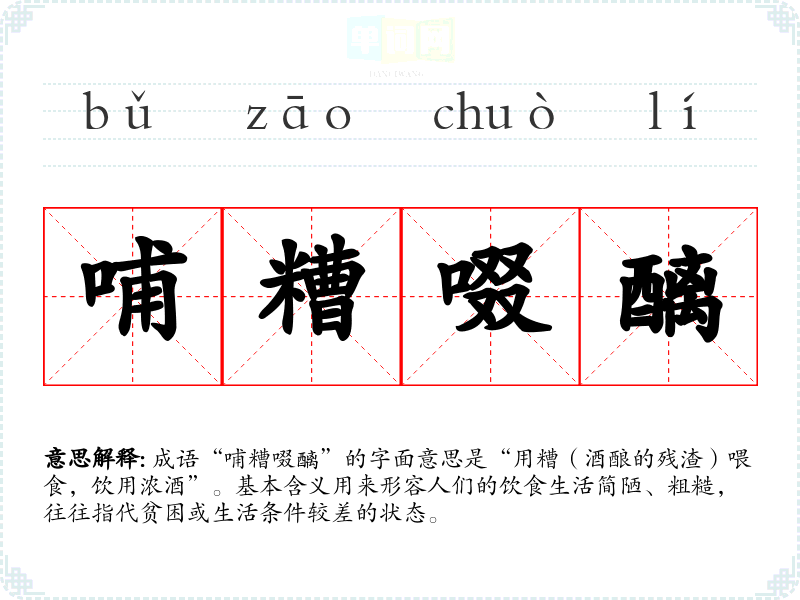 成语“哺糟啜醨”的字面意思是“用糟(酒酿的残渣)喂食,饮用浓酒”。基本含义用来形容人们的饮食生活简陋、粗糙,往往指代贫困或生活条件较差的状态。