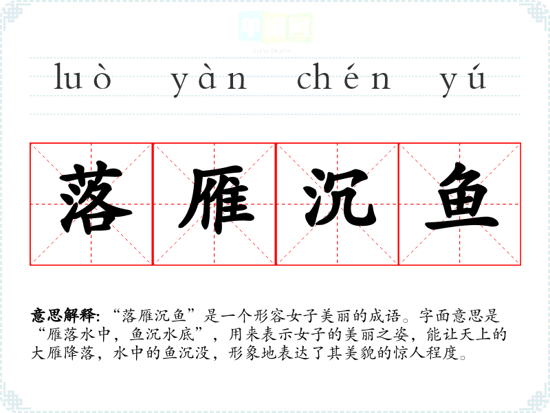 “落雁沉鱼”是一个形容女子美丽的成语。字面意思是“雁落水中,鱼沉水底”,用来表示女子的美丽之姿,能让天上的大雁降落,水中的鱼沉没,形象地表达了其美貌的惊人程度。