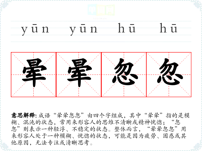 成语“晕晕忽忽”由四个字组成,其中“晕晕”指的是模糊、混沌的状态,常用来形容人的思维不清晰或精神恍惚;“忽忽”则表示一种轻浮、不稳定的状态。整体而言,“晕晕忽忽”用来形容人处于一种模糊、恍惚的状态,可能是因为疲劳、困惑或其他原因,无法专注或清晰思考。
