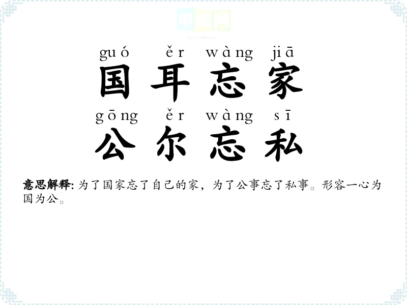 | 国尔忘家 | 一心为国,不顾家庭。 |