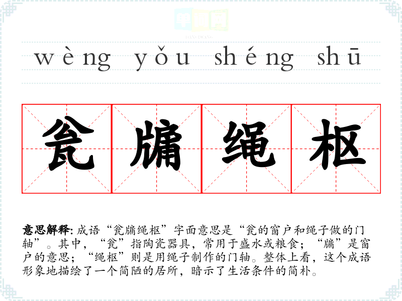 成语“瓮牖绳枢”字面意思是“瓮的窗户和绳子做的门轴”。其中,“瓮”指陶瓷器具,常用于盛水或粮食;“牖”是窗户的意思;“绳枢”则是用绳子制作的门轴。整体上看,这个成语形象地描绘了一个简陋的居所,暗示了生活条件的简朴。