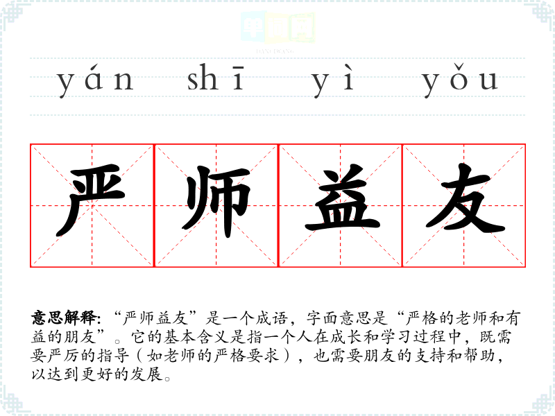 “严师益友”是一个成语,字面意思是“严格的老师和有益的朋友”。它的基本含义是指一个人在成长和学*过程中,既需要严厉的指导(如老师的严格要求),也需要朋友的支持和帮助,以达到更好的发展。
